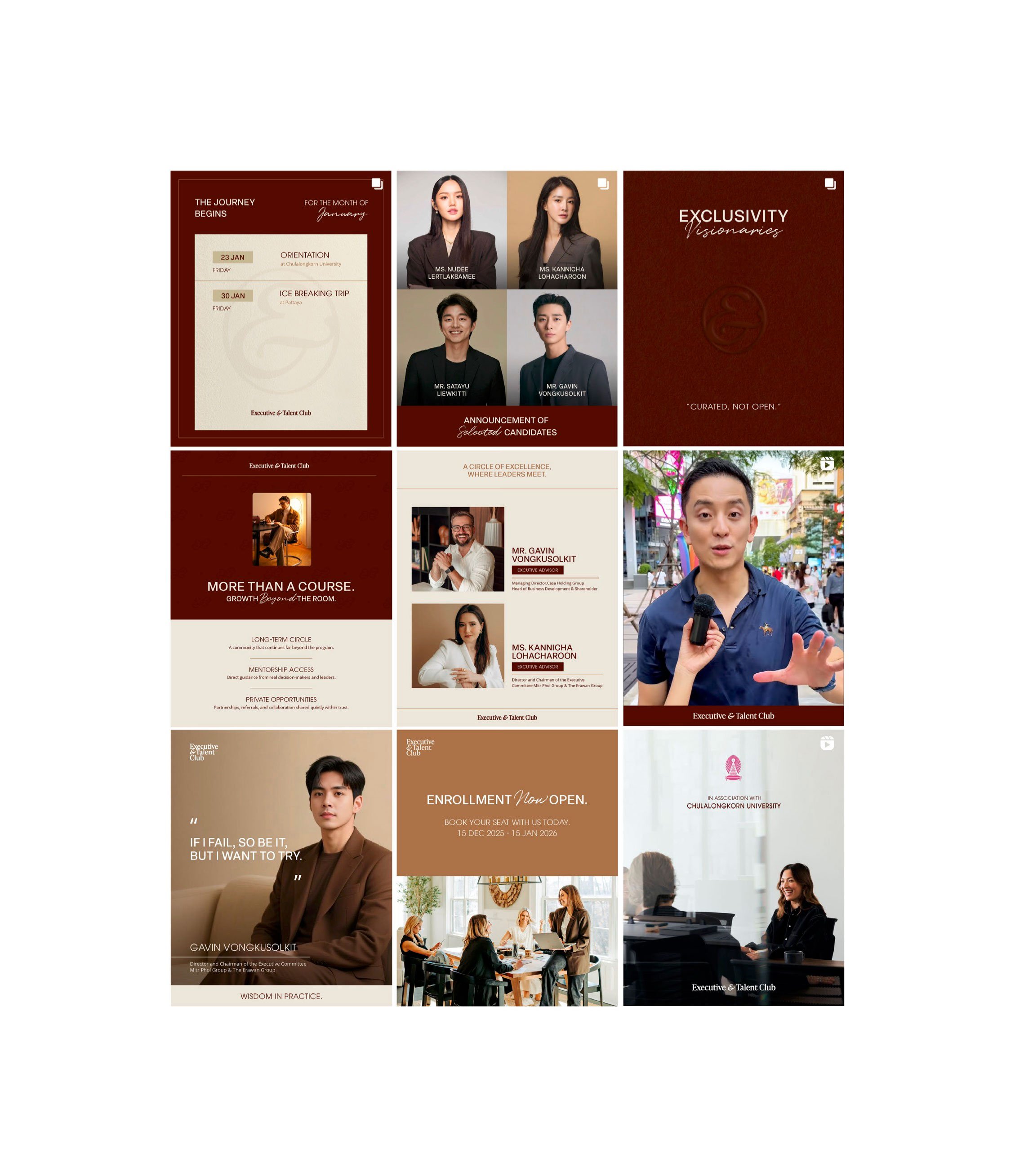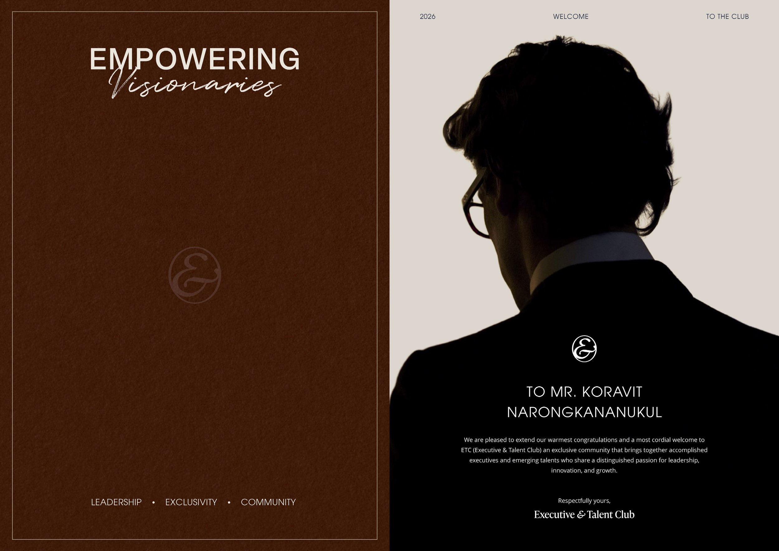 Executive & Talent Club Brand Identity Jan 19 Written By Suwanna Ruayrinsaowarot The Idea ETC (Executive & Talent Club) is a selective community connecting accomplished executives with rising talents. Built on Exclusivity, Leadership, and Community, it offers structured programs and mentorship led by top-tier leaders. Suwanna Ruayrinsaowarot suwannar.com