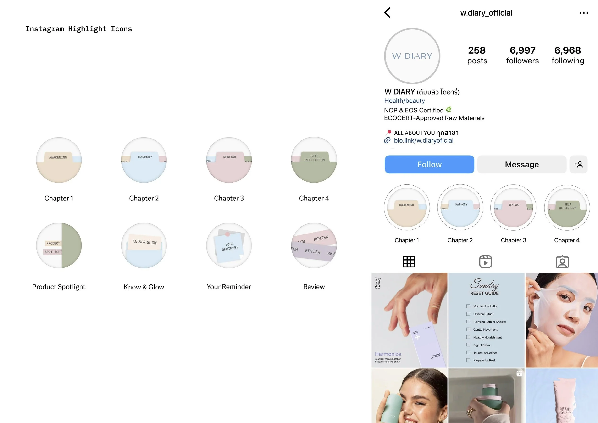 W Diary wanted to completely refresh their brand. Their product range was strong, but lacked cohesive packaging, emotional product names, and a distinctive social media presence. Their Instagram didn’t reflect the self-loving, friendly, and educational tone they aimed for.